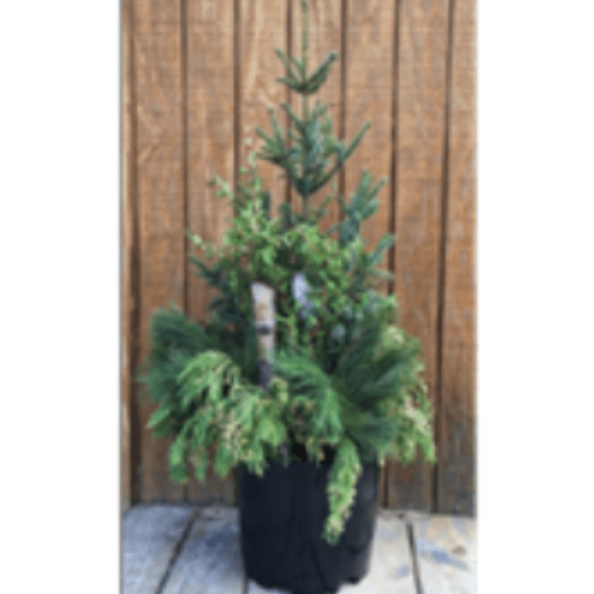 A very large outdoor planter that looks great next to your front door or walkway. Based with a black spruce evergreen tree and highlighted with incense cedar, blue berried juniper, a birch log, white tinted pine cone and Michigan cedar.